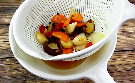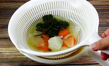 Strain and store the stock. Turn off the heat and scoop out the vegetables with a slotted spoon. Put a large bowl in the sink and set a fine mesh strainer over the bowl. Slowly pour the vegetable stock through the strainer into the bowl. You can use the stock immediately or pour it into smaller airtight containers or food-storage bags to use for later. You can refrigerate vegetable stock for 1 week or freeze it for up to 3 months. You can discard the vegetables and spices.