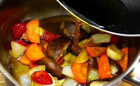 Remove the vegetables and heat the wine in a roasting pan. Take the vegetables out of the oven and transfer them to a large saucepan. Set the vegetables aside while you pour 1 cup (240 ml) of white or red wine into the empty roasting pan and set the pan on the stove. If the pan is large, you may need to put it over two burners. Turn the heat to medium so the wine begins to bubble gently. Stir and scrape up the bits on the bottom of the pan.
