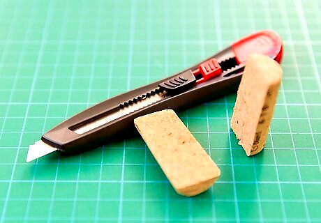 Use a sharp knife to slice a wine cork in half. Stand the cork up on one of its sides so that it is taller than it is wide, and use a sharp knife to slice it into two equal halves. Each halve should now have a flat and a rounded side.