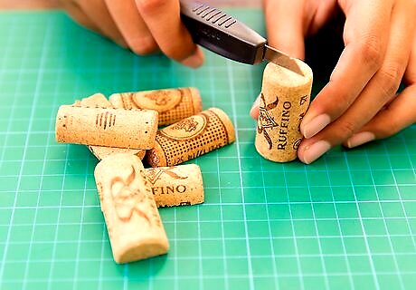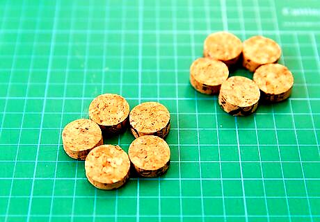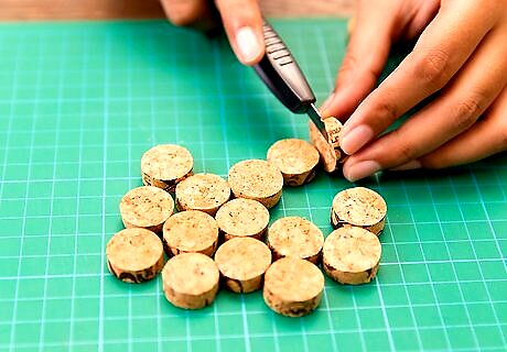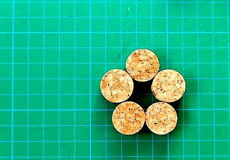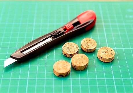 Cut a wine cork into five equal slices. Using a sharp knife, divide your cork into five equally sized slices. Slice the cork horizontally as you would a cucumber or piece of salami. You should have five cork discs.