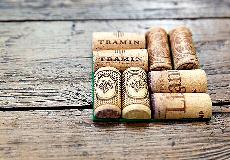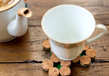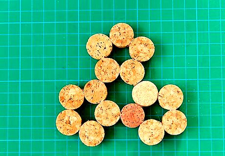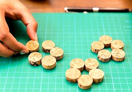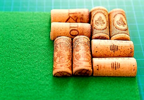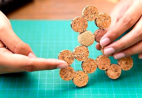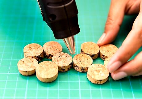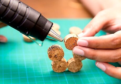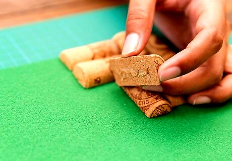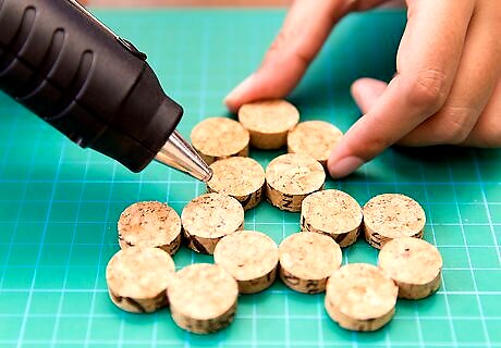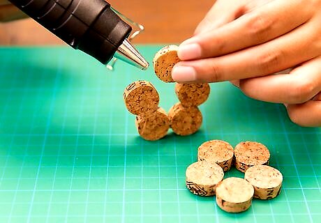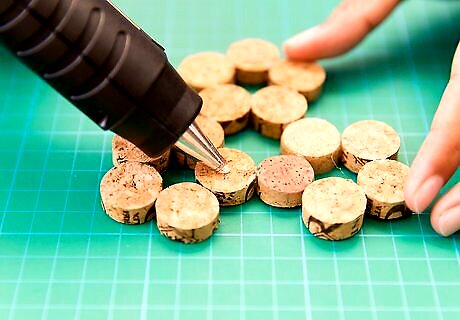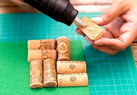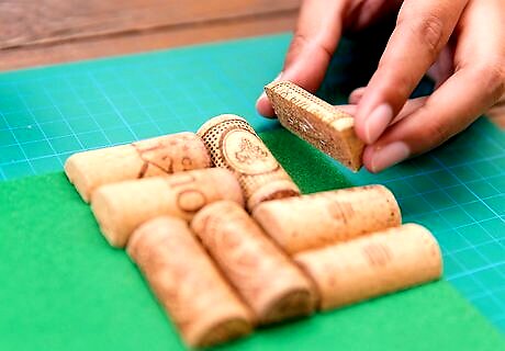 Apply hot glue to the bottom of a piece of cork. Being careful not to disturb the other pieces, lift one of the pieces of cork from the felt or cork board and apply glue to its flat bottom. Begin with one of the pieces of cork that is along the edge of the felt or cork board. This will help you maintain a straight edge.