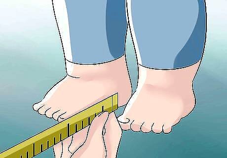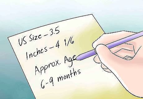 Measure your baby’s feet. For each foot, put the broad side of the tape measure against the outside, with the end of the tape measure either on the tip of the big toe or the end of the heel. For best results, measure two or three times. Babies wiggle a lot, and it can be difficult to get an accurate measurement.