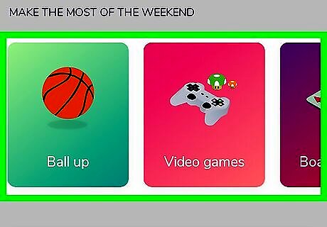 Tap an activity. Activities include a name and a cartoon drawing of the activity. Activities include movies and video games, outdoors and sports, and food and drink. If you tapped the Paper Airplane icon, you will create a new activity from scratch without a cartoon drawing.