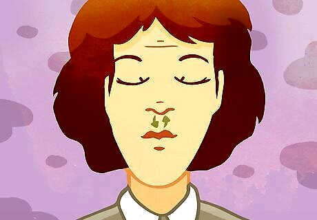 Take slow, deep breaths and concentrate on your breathing. Inhale slowly and deeply through your nose, and exhale slowly through your mouth. This sort of deep breathing works to fill your diaphragm with air, making it more difficult to cry (which is typically accompanied with short, rapid breaths). If it helps, tell yourself, “Breathe in, breathe out” while you do it. You can also incorporate self-acupuncture into your deep breathing exercises. Once you learn the pressure points, you can use them to stay calm. For example, you can press down on your Lung 1 pressure points, which are located just under your front shoulder joints on either side of your chest.