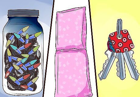 Use household objects to make crafts. If you're bored because you're stuck at home, there are a lot of crafts you can do with objects lying around the house. This can help lessen your boredom without forcing you to spend extra money or make an extra trip. You can make a fun night light by filling a mason jar with old Christmas lights. You can also glue the lights along the side of the mason jar in a fancy design. Do you have sewing supplies and old pillows? Try sewing several pillows together to make a long body pillow. If you have young children, this can be fun at sleepovers. Do you have a lot of keys for your home? Take some nail polish and paint the end of each key a different color. This will make it easier to grab the key you need in a hurry.