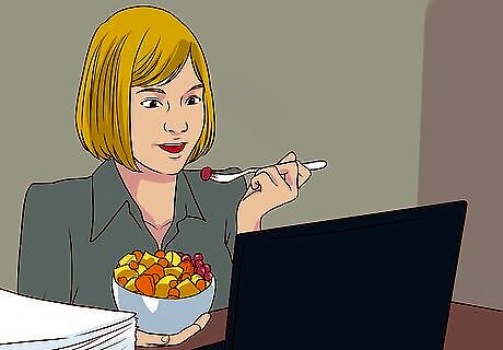 Regulate your blood-sugar. When your blood-sugar levels drop, you'll start noticing that it's increasingly difficult to pay attention to your work. Keep healthy snacks like nuts or fruit available in your work desk to keep your brain functioning at its highest level. Reward yourself with a bit of chocolate for finishing a particularly difficult homework assignment or series of memos at the office. Energy drinks and other caffeine sources are popular, but the "crash" associated with high-sugar caffeine drinks will end up affecting your productivity in the long run. Avoid these stimulants to keep from falling back in the bored rut.