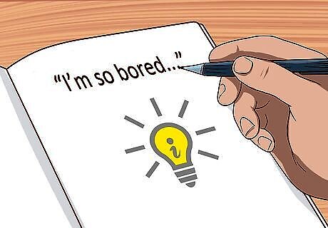 Be aware that high arousal states can contribute to boredom. You might associate boredom with a dull environment or feeling sleepy and lethargic, but people can also appear to be bored when they are overwhelmed by outside stimuli or when they are feeling really energetic on the inside and cannot focus as a result. For example, you might feel bored if you are at a busy café with loud music and lots of people talking around you. This might be the result of external stimulation from all of the noise overwhelming you or distracting you from completing a task. Or, you might think you are bored because you are bursting with energy and you can't seem to focus on one thing for more than a minute or two. Excess energy can come from normal sources, such as being well-rested or feeling nervous about an upcoming flight. When you feel this internal overstimulation, you might mistake it for boredom. If you are feeling overwhelmed by outside stimuli, then try to reduce it. For example, if your environment is too loud, then you could put on headphones and listen to some music or white noise. Or, you could try to go somewhere with fewer distractions. If you are overly energetic, then try doing something to expend some of your energy, such as going for a walk. Then, return to what you were doing after the walk.