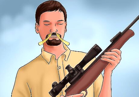 Control your breathing. Slowly take deep breaths and exhale. Focus on your front sight (or your reticle) and attempt to keep the rifle as steady as possible. Exhale most of the air from your lungs; you want to be in a completely relaxed state (do not force the air out of your lungs; just let it flow out slowly).