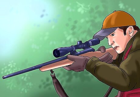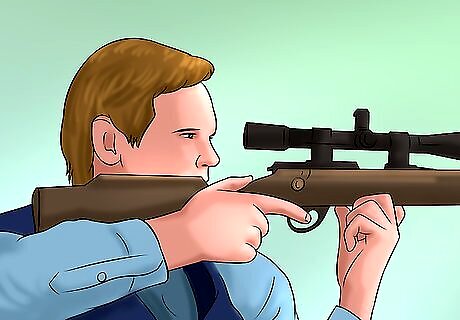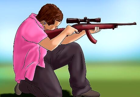Before you ever fire a shot (make sure you gun is unloaded when you do this), aim at the target. Place the butt of the stock on the inside of the "pocket" of your shoulder (slightly on your pectoral muscle). The support hand should be holding up the front of the rifle, with the elbow bent and pointed down toward the ground. The firing hand should be on the grip just rear of your trigger guard. Never put your finger inside of your trigger guard until you intend to fire. Place your cheek on the stock so you can look down the rifle. For an un-scoped rifle, focus hard on your front sight, then place the center post in the middle of the intended target. For a scoped rifle, the center of the crosshairs should be on the center of the target.