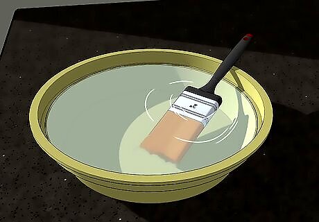 Clean your paint brushes. Remove excess paint with paper towels or newspaper and throw it away. Don’t rinse paint down the drain, as it can clog the drain. Once most of the paint is removed, clean the brush with warm, soapy water, taking care to remove the paint between the bristles. Rinse the brush to remove any soap residue. Place the brush on its side to dry. This will help maintain the shape of the brush.
