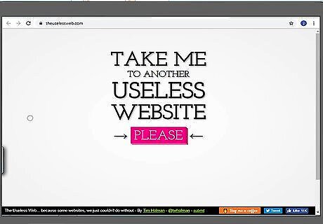 Visit random, pointless websites with Useless Web. Useless Web is essentially an archive of pointless websites. There are sites that show photos of dogs wearing hats, archives of random noises, or sites that let you click on random fruit to make them explode. Visit http://www.theuselessweb.com/ and simply click the button in the middle of the page to be transported to a random, pointless website. You may stumble on to something interesting, but you’re unlikely to find anything valuable when using Useless Web.
