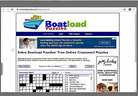 Exercise your brain muscles with sudokus or crosswords. Sudoku puzzles are played on a 9 by 9 grid with 9 separate squares laid out on top of the grid. The goal is to solve the puzzle by placing the numbers 1 through 9 on each column, row, and square without using the same number more than once. Crosswords are another excellent option. With crossword puzzles, you use clues to fill in spaces on a grid. Crosswords and sudokus are excellent puzzle games that require thinking, and are an excellent way to pass time while exercising your brain. A variety of crossword puzzles can be found at https://www.boatloadpuzzles.com/playcrossword. A variety of sudoku puzzles can be played at http://www.websudoku.com/.