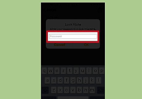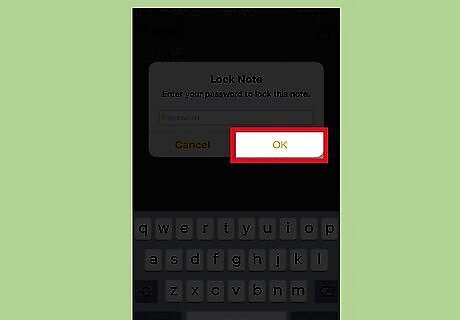 Tap the open padlock icon. It's at the top of the page, to the left of the Share button. Doing so will lock your note, meaning you'll need to use your Notes password or your Touch ID to open it. Whenever you unlock a note to view or edit it, you'll need to re-lock it by tapping the open padlock again.