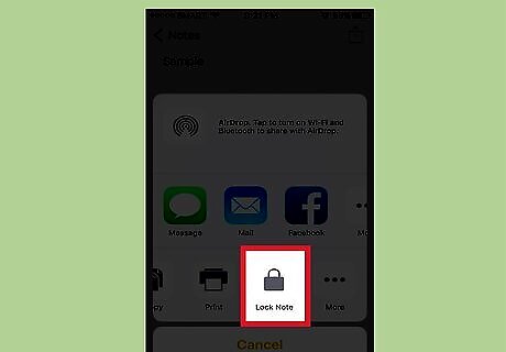 Tap Lock Note. This is the lock-shaped icon in the bottom row of options. You cannot lock notes that have PDFs, audio, video, or Pages attached to them. If your note is ineligible for locking, you'll be notified that you cannot lock the note when you select Lock Note.