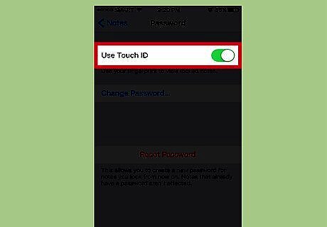 Decide whether or not you want Touch ID enabled for Notes. If you're using an iPhone 5S, 6/6 Plus, 6S/6S Plus, SE, or 7/7 Plus, you'll see an option entitled Use Touch ID at the bottom of the screen. If you don't want to use it, you'll need to slide the Use Touch ID switch left to the "Off" position. Touch ID is usually enabled by default. This will use the same fingerprint already registered with Touch ID.