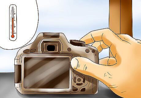Keep your camera at a steady temperature. When you are shooting photos in cold weather it's important that you gradually heat your camera. A sudden change in temperature could fog your lens or create condensation inside of the camera which could damage important electrical parts. Refrain from things like keeping your camera under your coat then quickly exposing it to the cold air. Store your camera in a car or on a porch to allow it to gradually adjust to the temperature outside. Keep an extra pair of camera batteries because cold drains them.