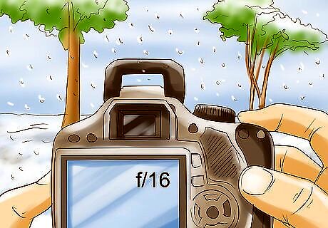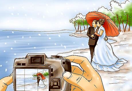 Change the shutter speed and aperture when it's snowing. If you use a tripod and set your camera to a longer shutter speed, falling snow will appear like streaks down your photo which can give it a powerful feeling. A shorter shutter speed will freeze the flakes in place which may make for a romantic and memorable photograph. Use a wide aperture if you want to vary how the snowflakes look. Test this with your camera before the wedding date to see which settings you want to use.
