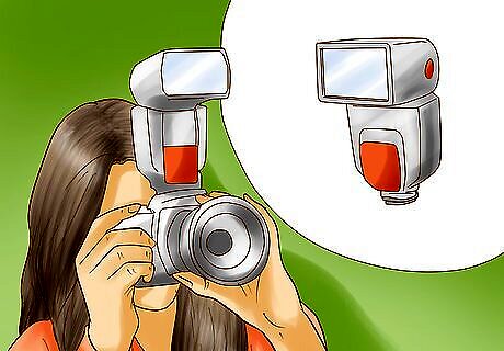 Use artificial light when it gets dark. During the winter, the days are shorter, and it gets dark outside sooner. To manage this, make sure that you bring artificial lights to take photos for when it gets dark outside. You can use a dedicated, through-the-lens (TTL) flash, spotlights, or clamp lights to achieve more light for your shoot. Using umbrellas and reflectors will help you control the level of light in your photos. Popular flashgun brands include Canon, Nikon, Pentax, Metz, Bower, and Vivitar. Popular professional lighting systems include Broncolor, ProFoto, Hensel and Lumedyne.