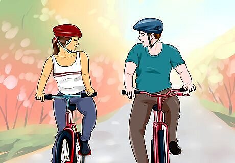 Rent a bike instead of a car. If you end up flying somewhere, ask yourself whether you really need a car. Many big cities are easy to navigate biking. If you, say, spend your honeymoon in Paris, try renting a couple of bikes to tour the city. This is cheaper than renting a car or taking taxis. Make sure you practice basic safety with bikes. Read up on the rules for biking in the street in your destination and always wear a helmet.