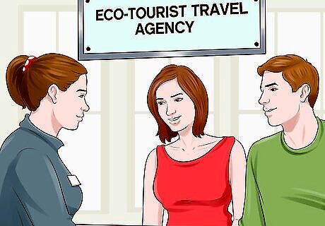 Meet with an eco-tourist travel agency. While travel agencies are somewhat dated, eco-tourist travel agencies are a version of travel agencies that are still around. An eco-tourist travel agent can help you and your partner plan a trip that minimizes your carbon footprint. If you can't find an agent in your area, use one online. With things like video chatting, it's easy to plan a trip using an agent through the internet. Let the agent know the specific ways you want to be socially conscious. In addition to minimizing harm to the environment, talk about how to respect local cultures and support local businesses as well.