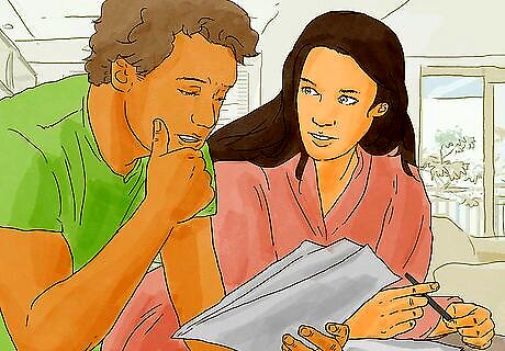 Schedule a meeting. To help you have a serious discussion about finances, schedule a meeting. Avoid talking about finances while lying in bed or when your attention is divided. You want to stay focused on one topic: finances. Find a quiet place and time to meet. If necessary, send the kids to visit friends or neighbors. You might need to hold a series of meetings if you can’t resolve all issues at once. You might want to block out a couple hours every Saturday afternoon to talk.