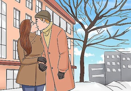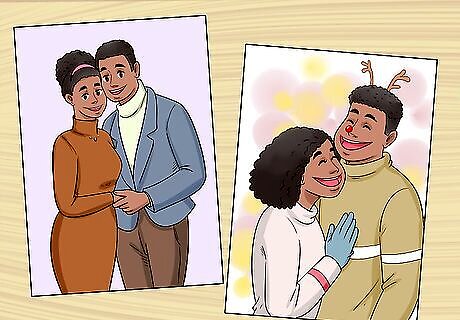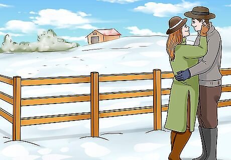 Use a snowy backdrop for your photography session. You and your partner could simply stand in front of a snowy scene. Or, you could be active and make snow angels in the snow. If being outside in the cold isn't your thing, you could have photos taken inside in front of windows showing a wintry scene. If you're going to get lay or play in the snow, plan those shots for last since your clothing will get wet.