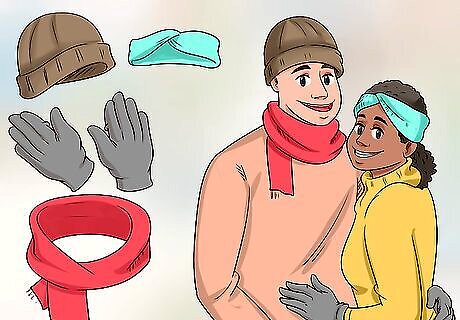 Choose wintry accessories. Keep warm by adding accessories to your outfit. You and your partner could wear items things such as a scarf, gloves, and a headband. If you have a wintry hat, like a beanie or knitted hat, wear that for outdoor photos. You could also wear items like a faux-fur vest.
