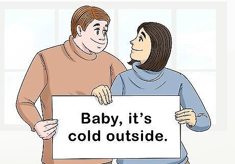 Use winter song or movie lines. Choose a few quotes from your favorite winter movie or song. Write the quote on a chalkboard, or paint the quote onto a sign. Hold or place the sign in front of you and your partner. For example, hold a sign that says “Baby, it's cold outside.”