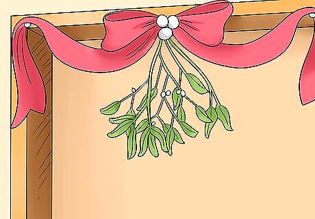 Hang mistletoe. Hang mistletoe from a branch or doorway. You can also have the taller partner hold the mistletoe over your heads. Have the photographer take a few shots of you and your partner kissing beneath the mistletoe.