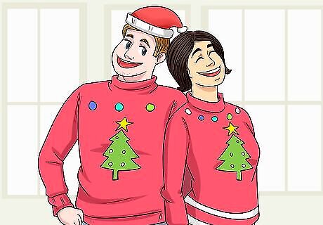 Wear festive clothing. You can wear formal festive clothing, like a glittery dress or sequined shirt. Or, you can wear fun and silly festive clothing. For example, wear tacky holiday sweaters for a few photos.