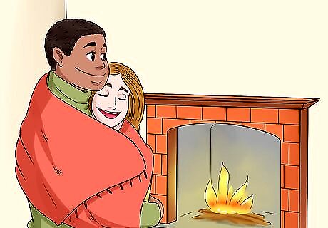 Cuddle up inside as a setting for photographs. You don't have to get cold to take wintry photos. Cuddle up with your partner in front of a fireplace. Go to a local café and grab a cup of coffee. You could also have photos taken of you and your partner baking holiday cookies.