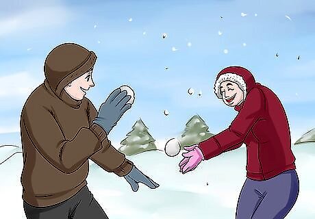 Have a snowball fight. Make your photos fun and full of action by having photos taken of you and your partner engaging in a snowball fight. You don't have to really hit each other with the snowballs—it's okay to simply act out the scene. You can also invite friends and family to partake in the activity.