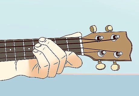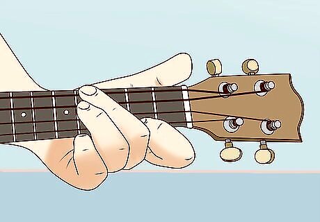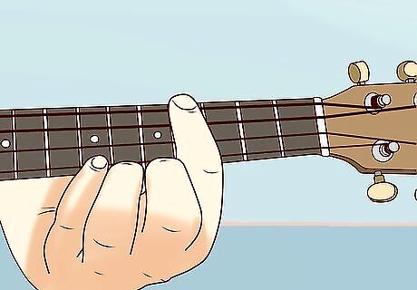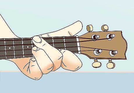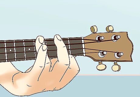 See if you can make the traditional chord shape. Before you start trying alternatives that may not play as clean, see if you can play an E chord the traditional way. This involves placing your index finger on the second fret of the A string, your middle finger on the fourth fret of the G string, your ring finger on the fourth fret of the C string, and your little finger on the fourth fret of the E string. This chord shape involves a lot of fingers crammed into a small space, which can lead to lots of problems. If you have larger hands or thick fingers, the traditional chord shape may not even be possible for you to do.Tip: Ukulele chords are also represented as text chords, which each number telling you the number where that string is fretted to make the chord. As a text chord, the standard E chord shape is 4442.