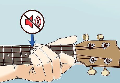 Mute the G string to play the x442 method. This shape is closest to the standard E chord shape but uses fewer fingers. Place your index finger on the second fret of the A string, your ring finger on the fourth fret of the C string, and your little finger on the fourth fret of the E string. Technically, when you play this version of the E chord, you don't play the G string at all. However, it can be tricky to avoid the G string when strumming, especially if you're a beginner. You get around this by muting the string with your middle finger or thumb so that it doesn't sound.Tip: To mute the string, simply rest your finger or thumb over the string. Don't place enough pressure to actually fret the string.
