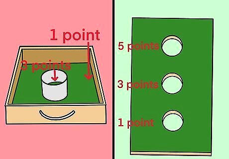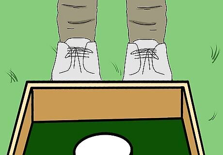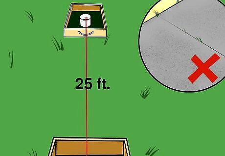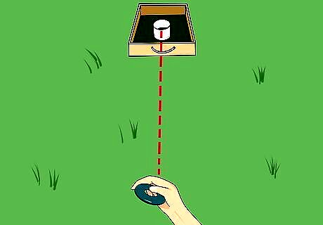 Place the boxes 25 ft (7.6 m) apart on a grassy surface. Choose a grassy area that isn’t in the way of anyone else and is suitable for playing on. Set 1 of the boxes on the ground, and measure 25 ft (7.6 m) from the center of the cup inside the box. Set the other box down so the centers of the cups are 25 ft (7.6 m) apart and they face one another. If you’re playing washers with children, move the boxes closer to one another so the kids don’t have to throw the washers as far. If you’re playing with a box that has 3 holes, measure from the centers of the middle holes. Avoid playing on a hard surface since the washers may bounce when they land.