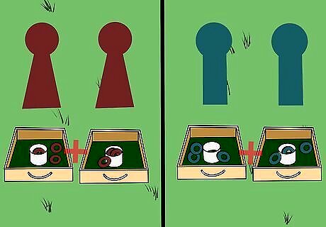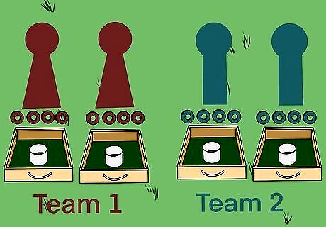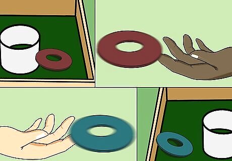 Divide the players into 2 teams. If you’re playing with 2 people, each person plays as an individual. If you have 4 players, split the group up into 2 teams consisting of 2 players each. You and your teammate will alternate rounds when you throw washers. Take 1 set of colored washers for you and your teammate. Depending on how you play, you may receive between 2-4 washers per team.