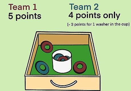 Cancel points if you and your opponent’s washers landed in the same place. Compare how many of your washers are in the cup compared to your opponent. Every time you and your opponent score in the same area, the points will cancel each other out so no points are awarded. If you have a majority of washers in the area, then you will earn points. For example, if you have 2 washers in the cup and 1 outside of the box, and your opponent has 1 washer in the cup and 2 outside of the box, 1 of your washers will cancel out your opponent's washer. You would receive 3 points for your 1 remaining washer in the cup.