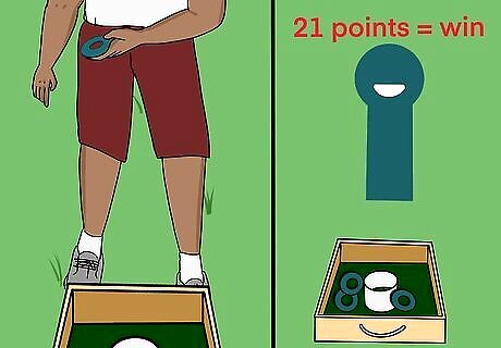 Continue the game until a player reaches 21 points. Start the next round from the box you just threw to so the player that scored points in the last round goes first. Play the rounds as usual, going back and forth between the boxes. When a player or team gets 21 points, they are the winner! If you’re playing with a teammate, you don’t need to switch sides after each round. A player or team needs to win by at least 2 points. If you get 21 but your opponent has 20, then you need to play until you reach 22 points. Other Winning Conditions If you score 11 points before an opponent scores any points, it’s considered a “skunk” and you win. If you score 17 points and your opponent has only scored 1 point, then the game is a “whitewash” and you win.