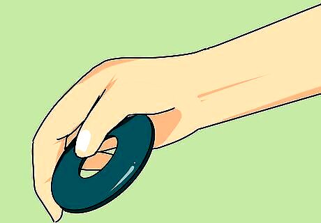 Hold the washer between your index finger and your thumb. Hold your washer in your hand so it’s parallel to the ground. Wrap your index finger around the front edge of your washer and support the back side with your thumb. Curl your other fingers so the washer rests on top of them while you hold it. Try angling the washer away from you when you throw it if you want it to bounce less when it lands.