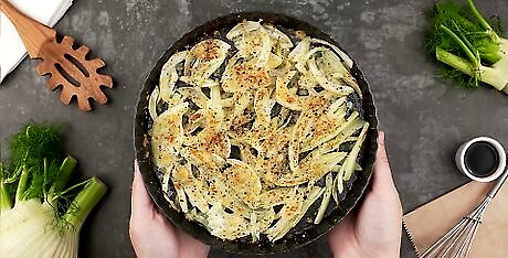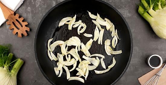 Place 1 tablespoon (14.7 ml) of vegetable oil in a sauté pan, and heat the pan until warm. Place the fennel pieces into the pan, and cook until tender.