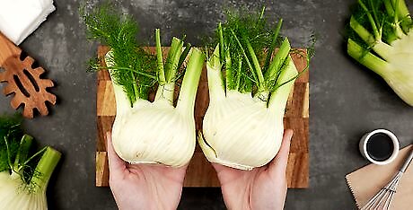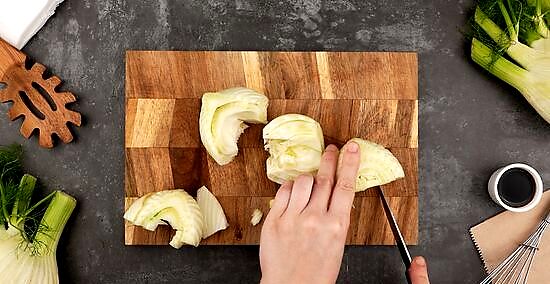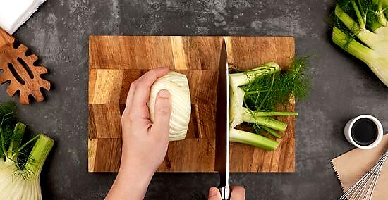 Use a sharp knife to cut away the stems and the root end of the fennel bulbs.