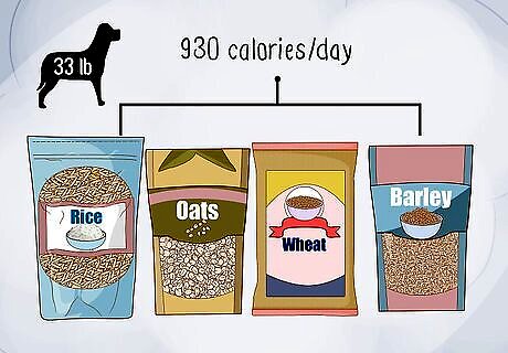 Include carbohydrates. Carbohydrates are where most of your dog's calories should come from. Specifically, half of your dog's diet should come from carbohydrates. An active 30 pound dog needs around 930 calories a day. To make sure he's getting them, include wheat, rice, oats, and barley in his diet. Carbohydrates provide energy (while some is given from protein and fat). They also give fiber for healthy gut function.