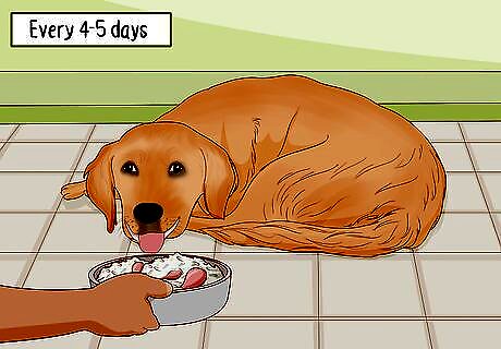 Have a backup plan if you run out of food. If you're cooking for your dog every 4 to 5 days, you probably won't experience major problems. But, you may occasionally run out of food or have a dog with a stomach ache, which requires a gentler diet. In both these cases, a home-prepared diet of chicken and rice is gentle on the bowels and serves as a short-term solution to when you run out of regular food. Avoid feeding a chicken and rice diet in the long term, since it's lacking in minerals and vitamins. To prepare chicken and rice, use 1 cup of boiled chicken breast meat mixed with 2 to 3 cups of boiled white rice. Don't add fat or oil to the chicken. Give a similar volume of food to what you'd normally give; use your judgement. Typically this would be around 1 1/3 cups of chicken and rice per 10 pound body weight.