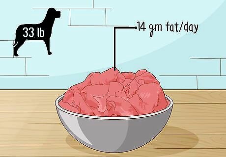 Add fats. A 33 pound adult dog (about the size of an average Staffordshire bull terrier) needs at least 14 grams (0.49 oz) of fat a day. You can make sure your dog is getting fat in his diet by including meat or feeding chicken skin. It's recommended that a minimum 5% of your dog's diet comes from fats (by weight). Fat contains fat-soluble vitamins which are essential for good health. They also play a role in creating new cells proper cell functioning.