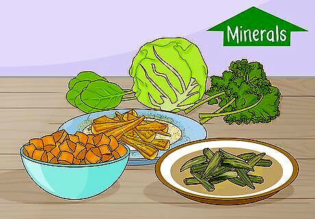 Include minerals. Dogs need calcium, phosphorus, magnesium, selenium, iron and copper to mention but a few. Mineral deficiencies can lead to a variety of problems, including weak bones prone to fracturing, anemia, or poor nerve conduction which can lead to seizures. Different foods contain varying degrees of minerals, especially fresh vegetables which require careful research to make sure your dog's diet is getting enough of each. Try to include the following high-mineral vegetables in your dog's diet: Green leafy vegetables (raw or cooked), such as spinach, kale, spring greens, brussel sprouts, Bok choy, and chard Butternut squash (cooked) Turnip (cooked) Parsnip (cooked) French beans (cooked) Okra (cooked)