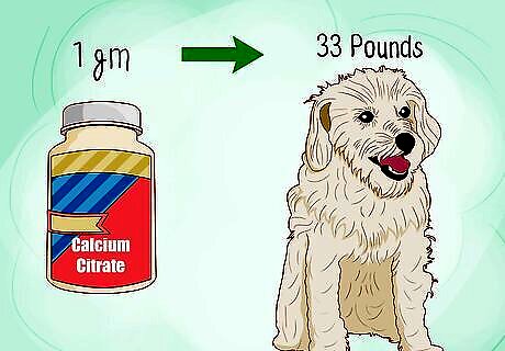 Supplement the calcium in your dog's diet. Dogs have a very high requirement for calcium and while you could give your dog a bone, there are health risks. Bones can splinter, scratching the lining of the bowels and causing painful inflammation and septicaemia (blood infections). Instead, you can add calcium carbonate, calcium citrate, or eggshell crushed into a fine powder. 1 teaspoon is equal to around 2,200mg of calcium carbonate, and a 33 pound adult dog needs 1 gram (0.035 oz) a day (half a teaspoon). Bones can also knit together within the gut and cause blockages that need surgical removal. It's also very difficult to know when the dog has gotten enough calcium from the bones he does eat.