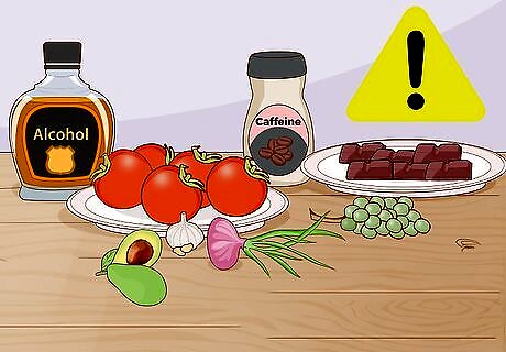 Know which foods are toxic to dogs. Many people are familiar with the warning that chocolate is harmful to dogs. But, there are several other foods that are fine for people but toxic to dogs. When trying out a new recipe always double check that the ingredients are safe for your dog. Never feed your dog: Raisins Grapes Onions (including shallots and chives) Garlic Tomato Chocolate Avocado Yeast dough Caffeine Alcohol Artificial sweeteners Xylitol Macadamia nuts