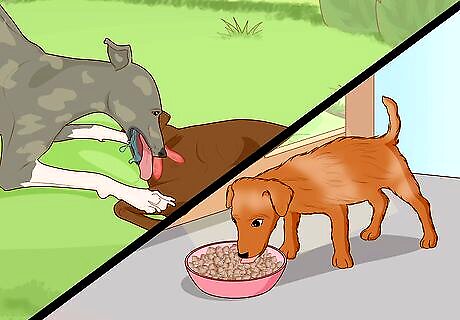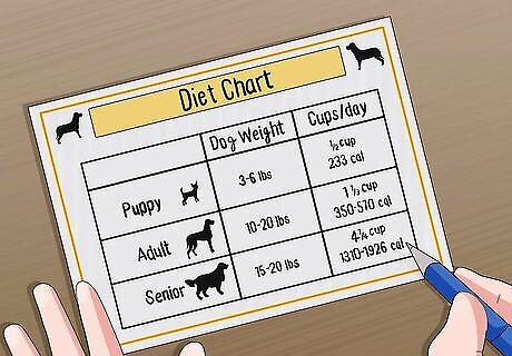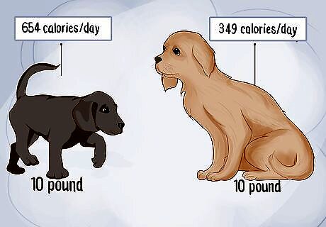 Know how much to feed your dog. You'll need to research how many calories your dog actually needs to keep him from becoming overweight or losing weight. The calorie requirement for a dog isn't a linear arrangement. For example, a 40 pound dog doesn't need twice as many calories as a 20 pound dog just because he weighs twice as much. You can look up several charts for basic daily calorie requirements for dogs. That will give you a general idea of how many calories your dog needs based on his weight. Once you've found a general guideline for your dog's weight, take into consideration any lifestyle differences that require an adjustment (such as pregnancy, obesity, age of your dog, and whether your dog is neutered or spayed). For example, a 10 pound puppy under 4 months old needs 654 calories while an older neutered 10 pound dog only needs 349.