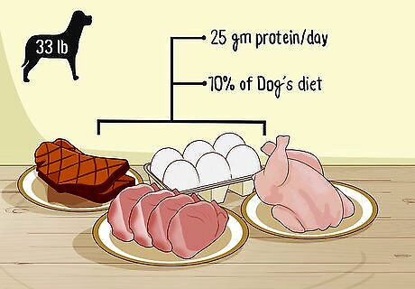 Include protein. A 33 pound adult dog needs a minimum of 25 grams (0.88 oz) of pure protein a day. This can include egg (which has a high amount of the essential amino acids required by dogs), followed by animal protein, such as meat from chicken, lamb, or turkey. High-quality vegetarian sources, like high-protein pulses, seeds, and eggs, can also supplement the diet. Try to make sure that a minimum 10% of your dog's diet is coming from quality protein (meat). Protein is made up of small building blocks called amino acids. There are 10 amino acids which dogs cannot make for themselves and must be supplied in their diet.