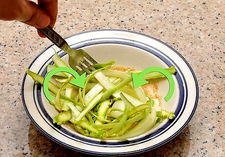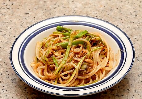 Mix the shaved asparagus into pasta. Because shaved asparagus has a similar shape and size to fettucine, it’s an ideal mix-in for pasta dishes. Mix it into a simple fettuccine alfredo or carbonara to give it some delicious spring flavor. Asparagus shavings don’t just work with cream pasta sauces. Mix it into your favorite tomato-based pasta, garlic and oil recipe, or other pasta dishes.